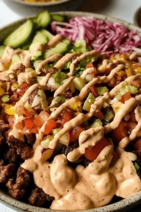 A deconstructed burger bowl with seasoned ground turkey, melted cheddar, roasted potatoes, lettuce, tomato, and pickles with a side of burger sauce.