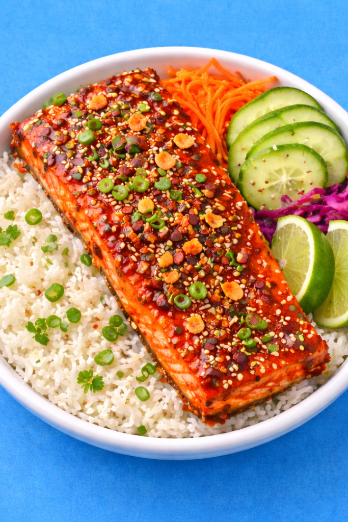 Roasted salmon glazed with a sweet and spicy chili crunch sauce, served with a balanced base and fresh garnishes for a bold, viral-inspired bowl.