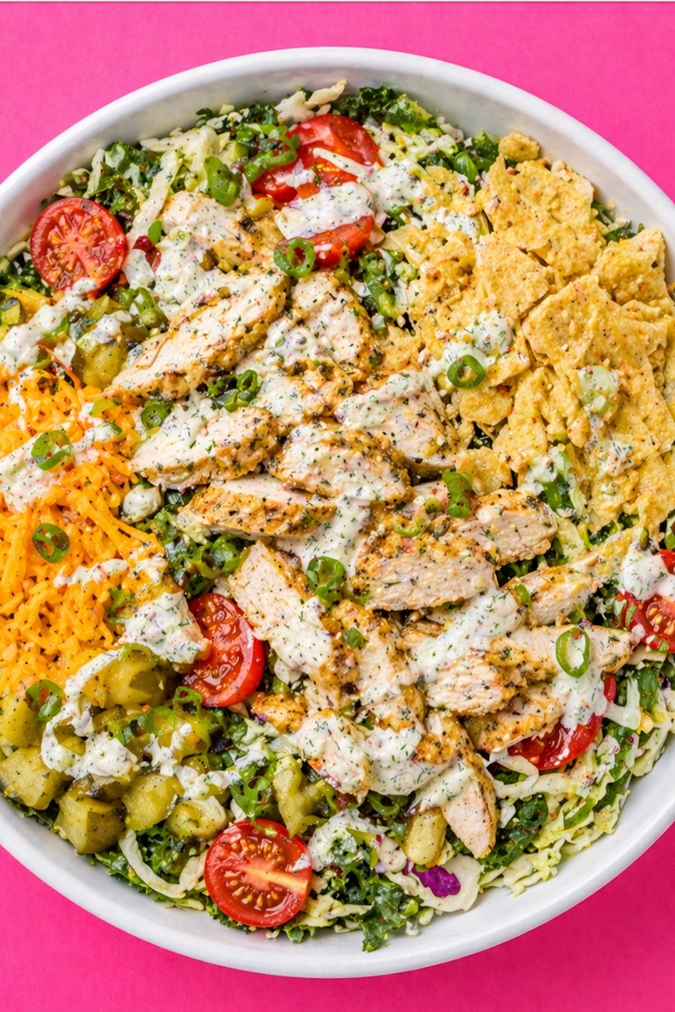 Shredded cabbage and kale tossed with tangy pickle-marinated roasted chicken breast, sharp cheddar, juicy tomatoes, diced dill pickles, and fresh green onions, finished with a creamy dill pickle ranch and crunchy gluten-free chips on top.
