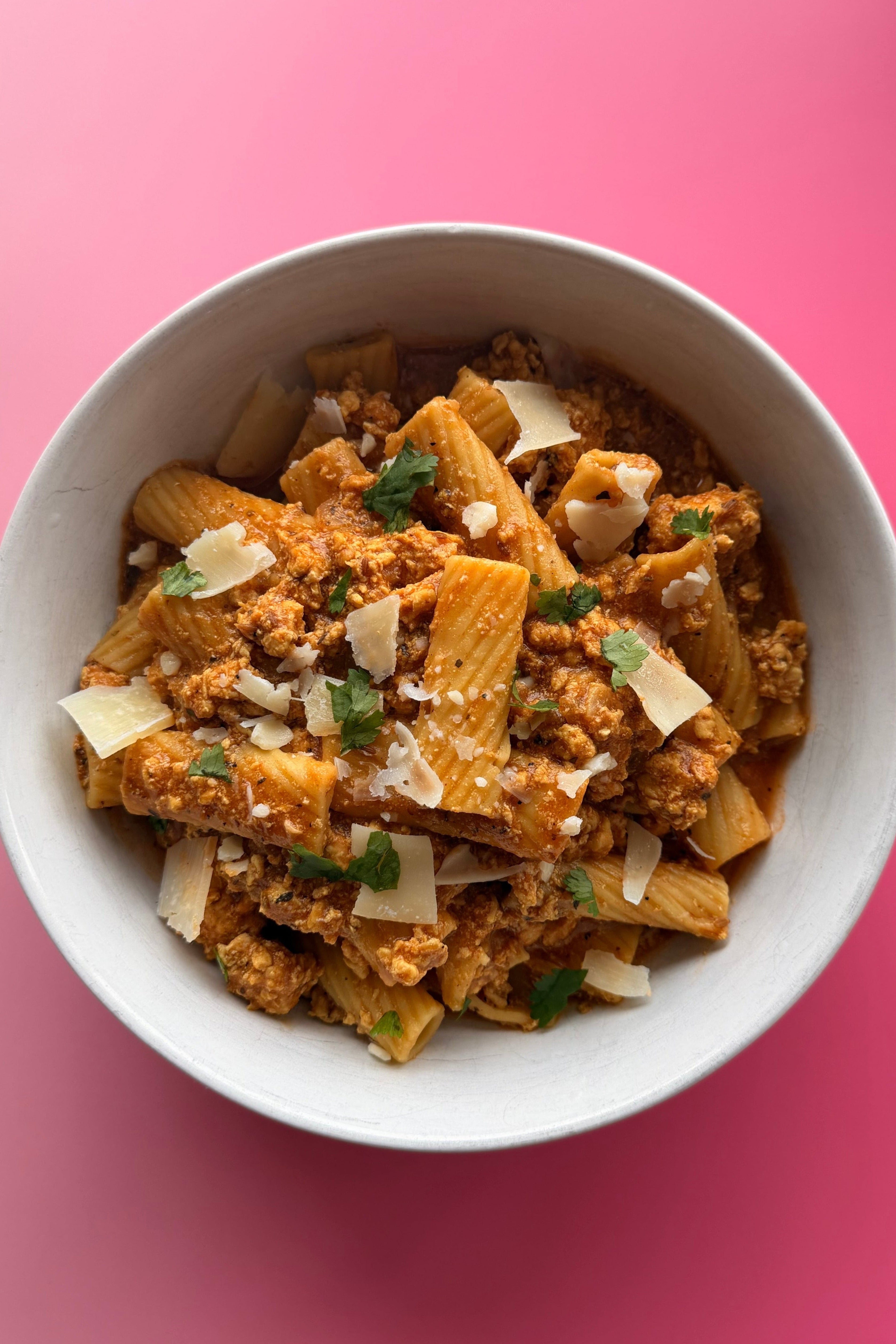 Ground beef and shallots tossed in a creamy pumpkin-tomato sauce with garlic, sage, and a hint of chili. Served with rigatoni and topped with shaved parmesan for a cozy, seasonal pasta that’s gone viral for a reason.