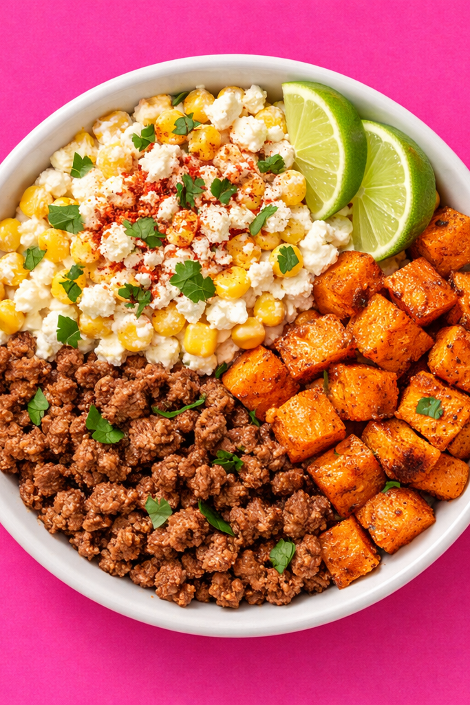 Seasoned ground beef served with roasted sweet potatoes and a creamy street corn topping finished with lime and spices.