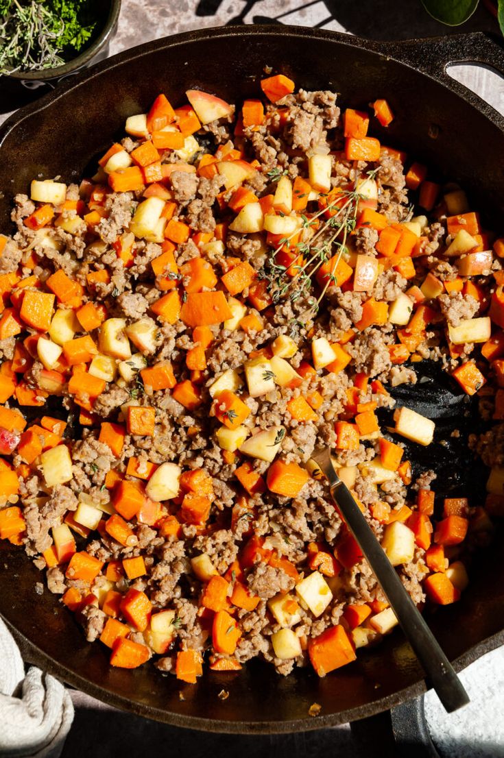 The ultimate savory-sweet hash made with lean ground turkey, roasted sweet potatoes, apples, bell pepper, onion, and spinach, seasoned with warm spices. Finished with toasted walnuts for healthy fats.